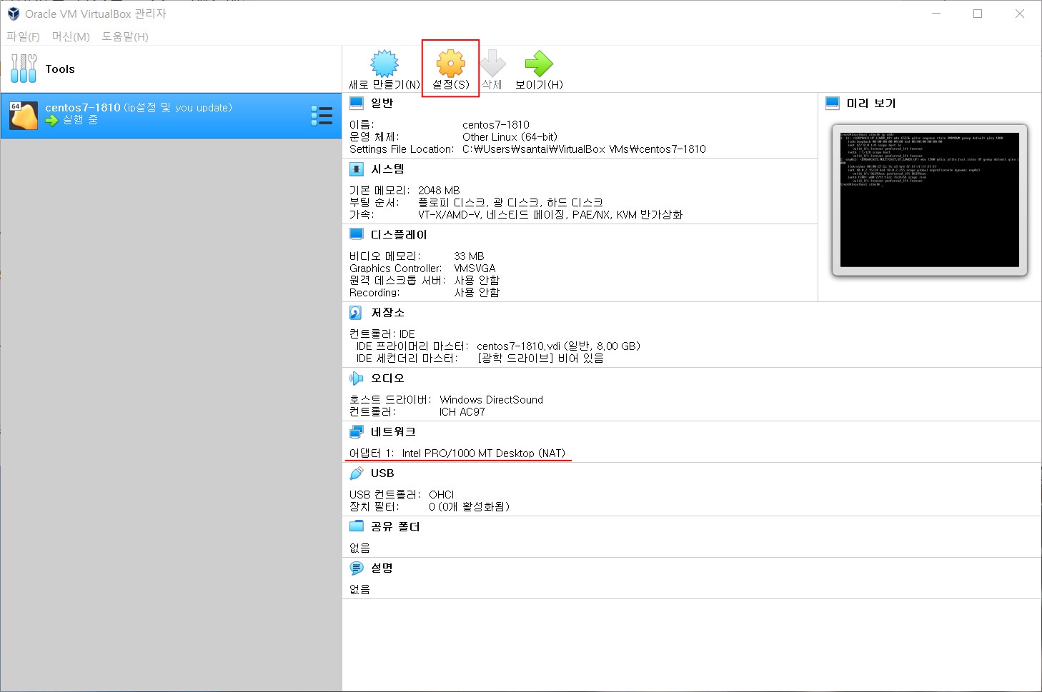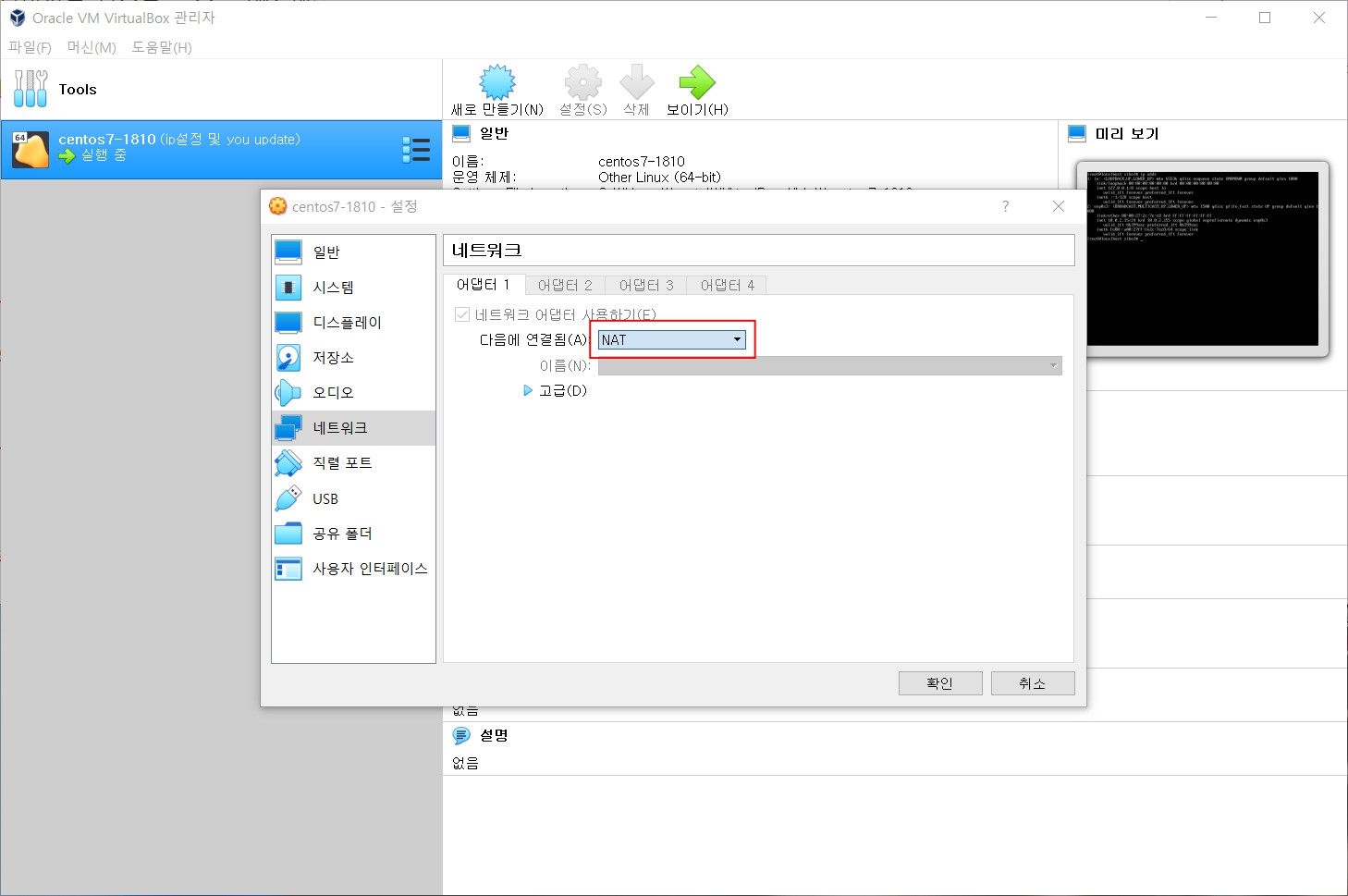 네트워크 보면 NAT로 되어 있습니다.