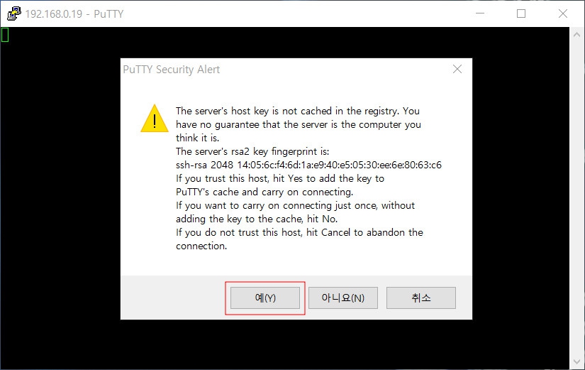 정상적으로 192 대역대로 바뀐것을 확인 후, putty로 접속해줍니다.